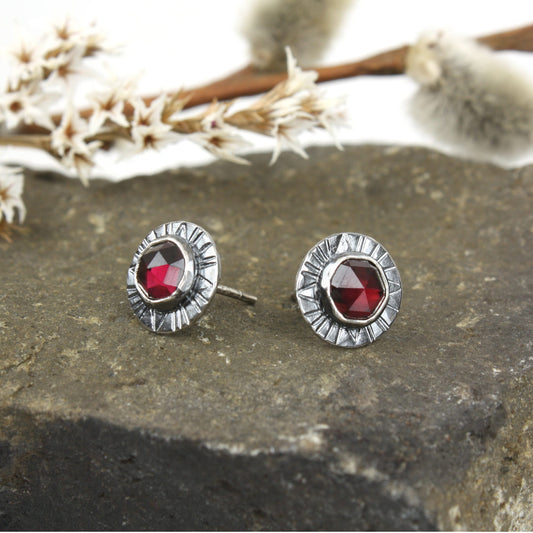 Compass Stud Earrings with Rose-cut Garnet (Sterling Silver)