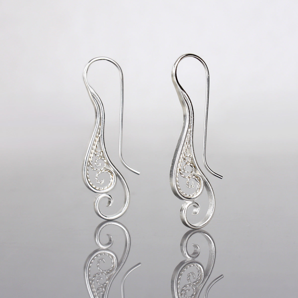 Swirling elegant silver filigree earrings. These lovely earrings are lightweight, eyecatching, and incredibly detailed.