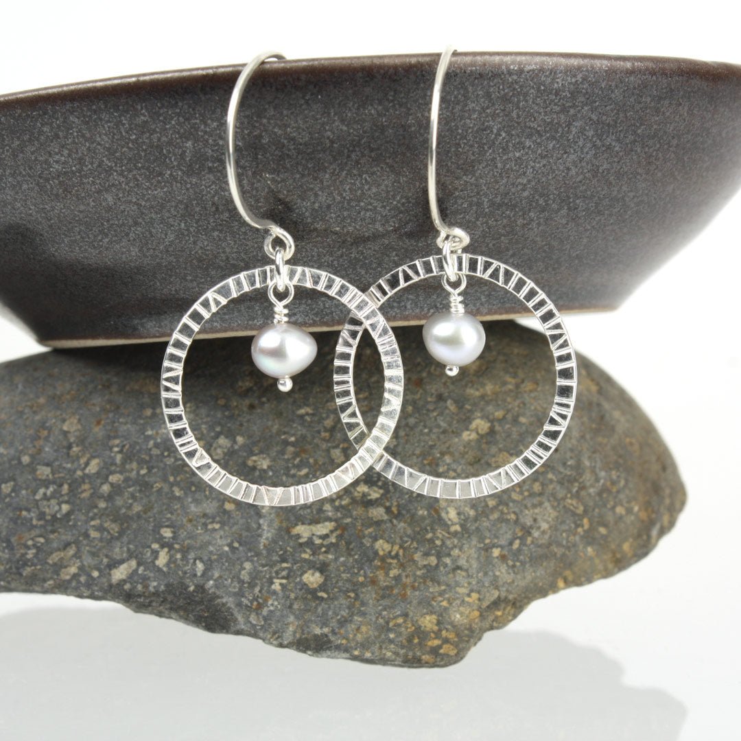A sterling silver halo, stamped with compass points, encircles a natural freshwater pearl, all dangling from sterling silver handmade ear hooks. These earrings are simple and lightweight, adding a touch of elegance and sparkle to any outfit. The pearls are not quite white, but slightly silver-gray - classic and neutral, and just a little bit unique.