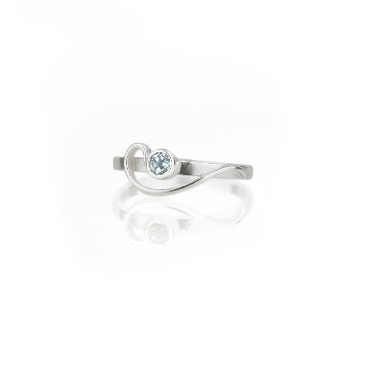 The so-called "whiplash line" is one of the defining hallmarks of the Art Nouveau style. Here, the whiplash curves in a graceful arabesque around a sparkling gemstone and entwines around your finger. The Arabesque Ring is dainty and elegant when worn alone; but this slender stacking ring is designed to nestle closely with one or more accompanying bands.