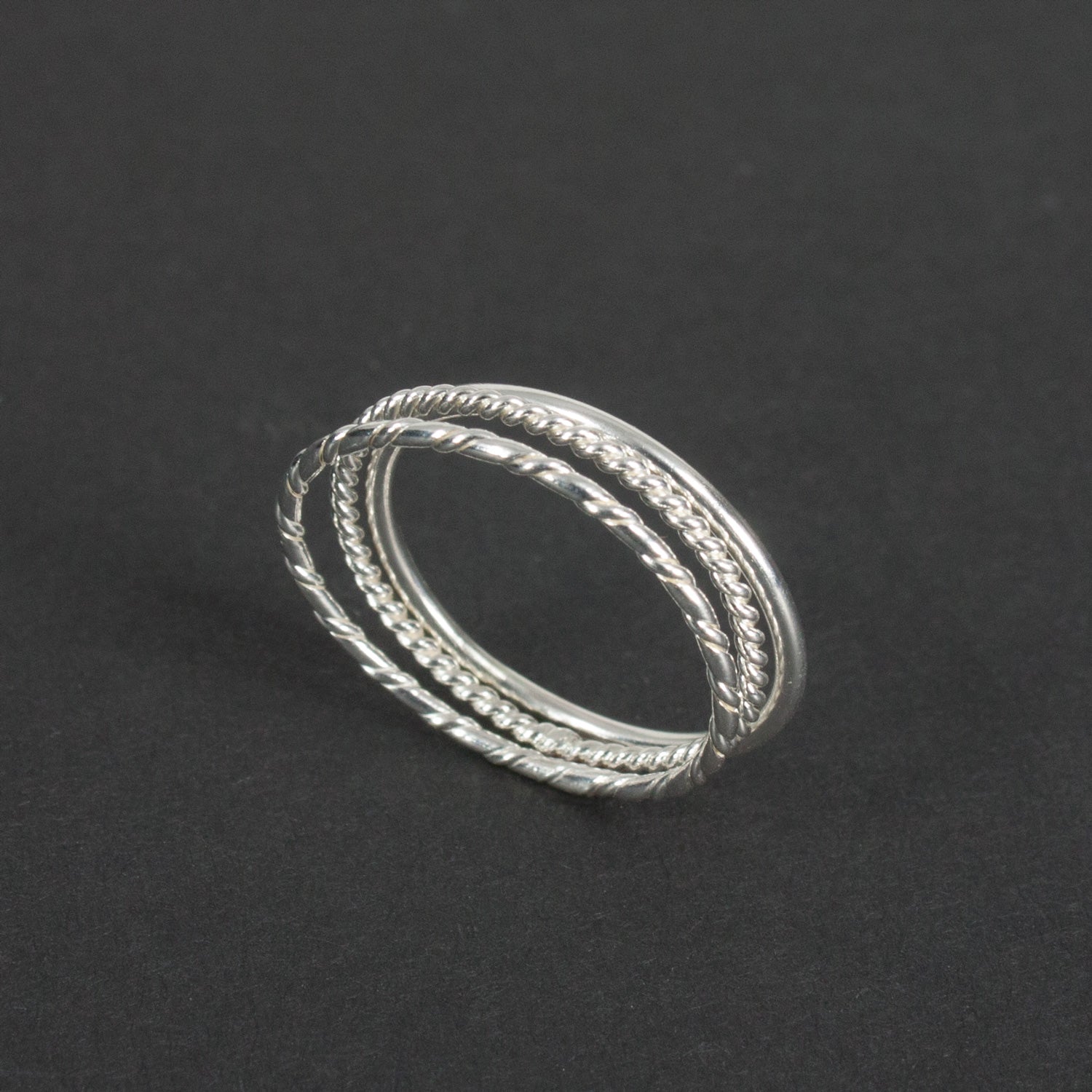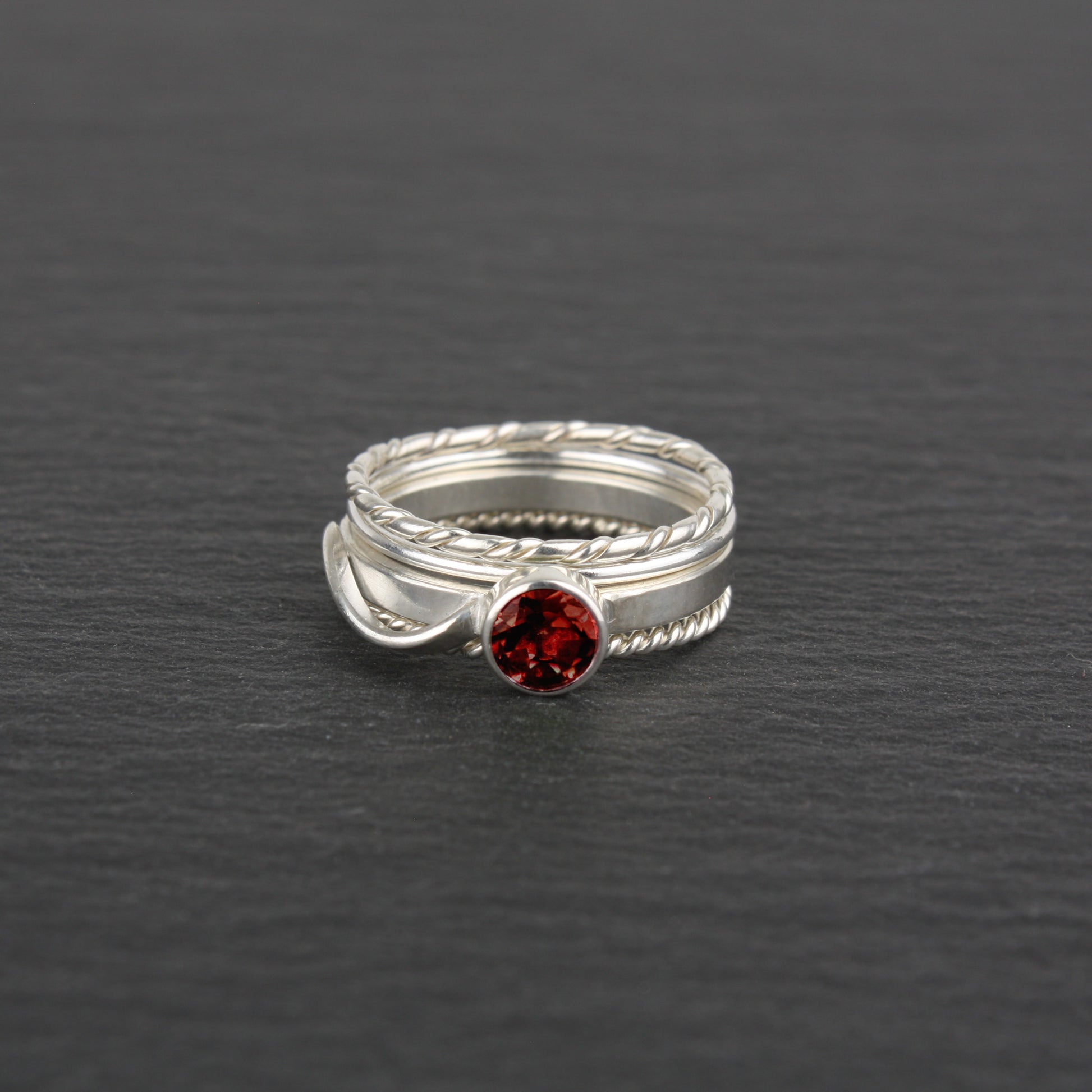 This listing is for a set of 4 rings. The star of the show is a 2mm wide band with a large (5mm) garnet and a silver flourish. It is flanked by 3 skinny patterned rings. They can be worn in any order, or even combined with another ring you already have. Individual silver stacking rings are also sold separately for $15 each; you get a bit of a discount when purchasing a set.