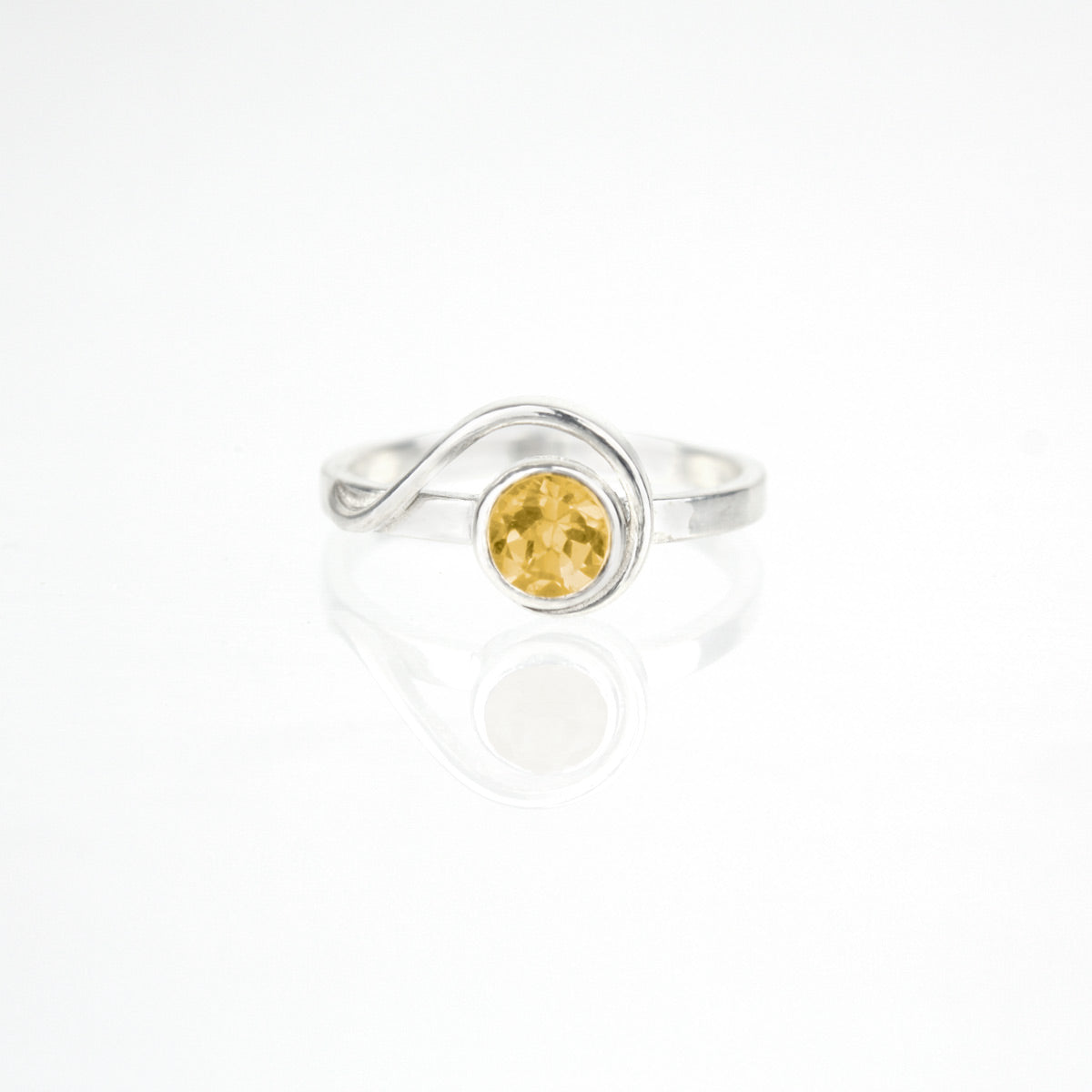This ring incorporates a delicate swirl of silver emanating out from a sparkling gemstone, before wrapping back on itself as it falls around the side of the band. The 5mm Spiral ring is flashier than its daintier sisters, but still has a slender band designed to nestle closely with one or more accompanying rings.