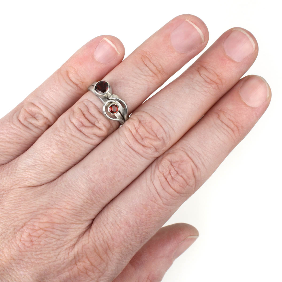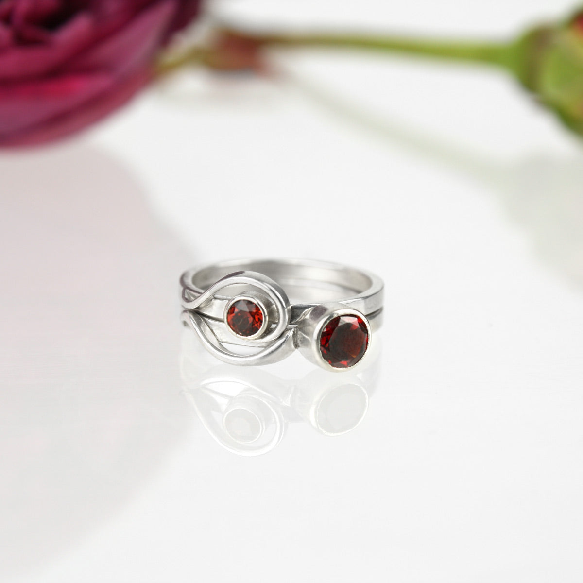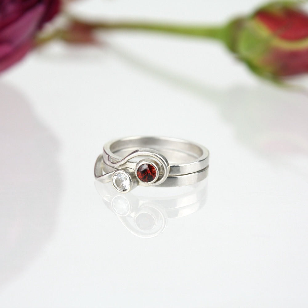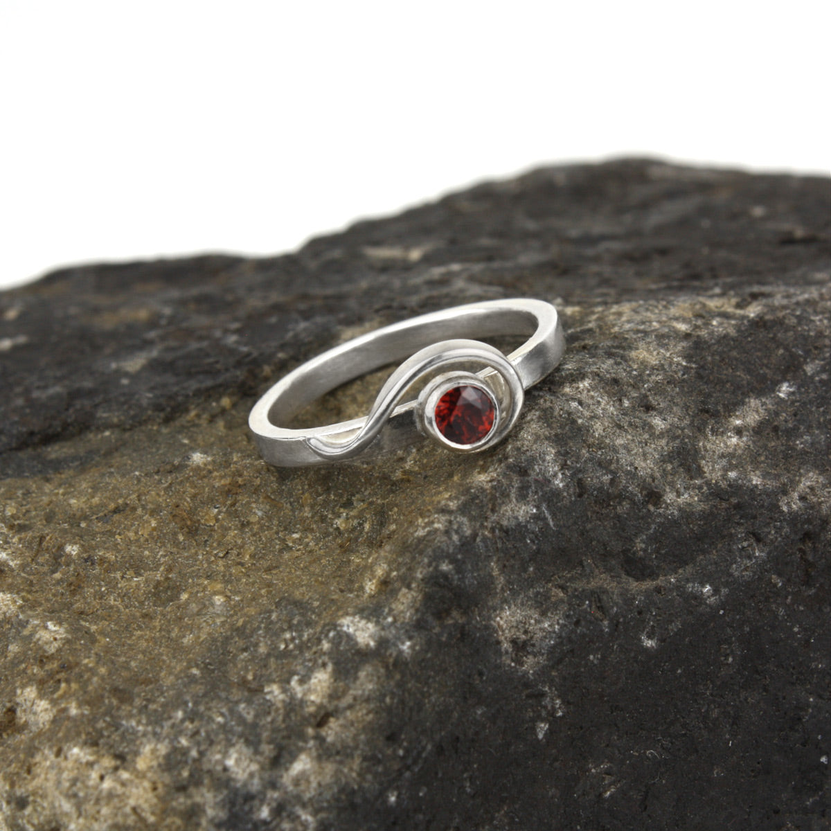This ring incorporates a delicate swirl of silver emanating out from a sparkling gemstone, before wrapping back on itself as it falls around the side of the band. The Spiral ring is dainty and elegant when worn alone; but this slender stacking ring is designed to nestle closely with one or more accompanying bands.